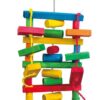 A large long hanging wooden toy with groovy blocks which encourage chewing, giant wooden discs and small plastic beads