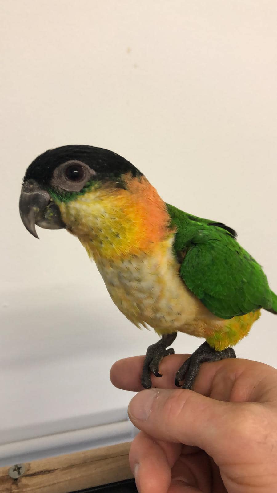 I got my chico (green thighed caique) from mark in early november, he is an absolute delight. From the moment i went to see mark, i watched in awe at mark hand feeding all the babies he had, one of whom was to be my chico. Chico is handled daily by everyone in our house and other family members aswell! Lots of friends and family love him for his personality and character but also because he loves to be handled and loves to get cuddles and scratches, almost demanding them sometimes. Mark kept us informed with regular updates and its great to know that any questions i have i can always ask mark. I have recommended him to so many people. My hubby and i were both so impressed by mark and how he rears his bird. They are all very affectionate and its clear mark has a unique ability when it comes to hand rearing, understanding each birds uniqueness and quirks. It didnt take long before we were collecting our 2nd bird from mark to join our flock, and we call regularly to purchase toys, food and have a general chit chat! I implore anyone considering to get from mark, dont hesitate, just get in contact and youll see for yourself just how mark plus birds just make sense! A genuine pro in this field and a rarity at that….