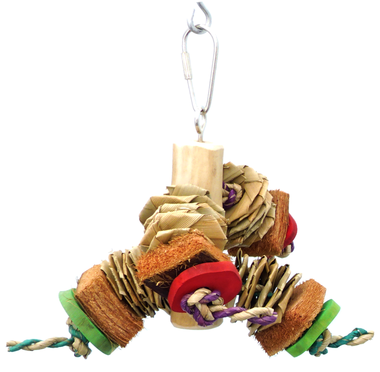 A tough java wood central wooden piece with crinkles of chewable material, natural coconut fibre, java discs and natural rope.