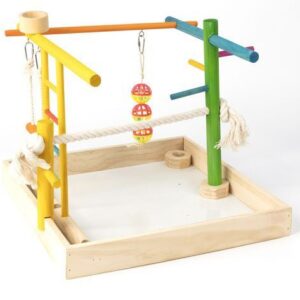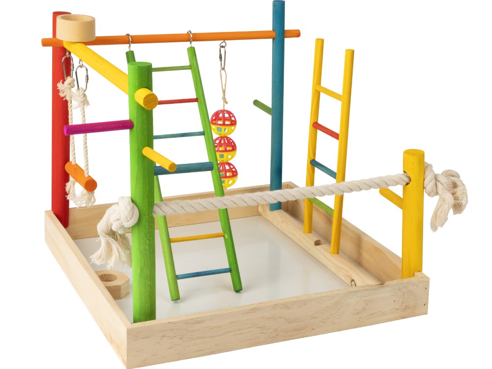 This playground is designed for small to medium sized birds. It includes ladders, swings and perches. It also includes hanging toys to encourage climbing and exploration.