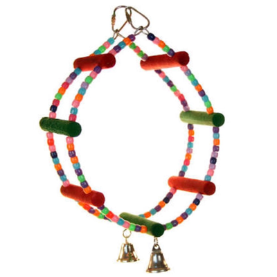 2 in 1 Fun Toy & Swing for small birds. With bright colourful beads and wooden steps your bird will enjoy chewing and climbing his way round the Carousel.The swing has two bells to attract the attention of your parrot and keep them focused on the toy.The toy is designed to encourage the two most common activities for parrots – Climbing and Chewing.