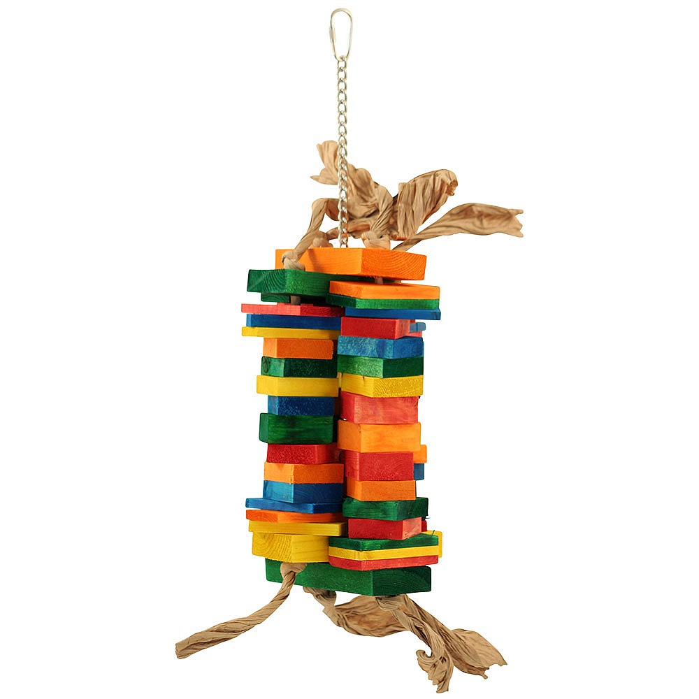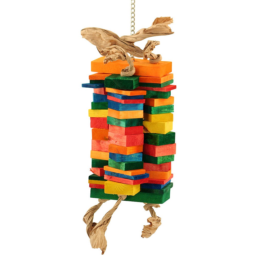 Coloured wood block towers, create a fortress in which you can place some rewards. The Temple Towers Parrot Toy is part of the Zoo-Max range. With loads of colourful wood blocks and slices stacked together. There is plenty to keep a Parrot’s beak busy.